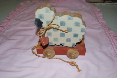 2. Checkered Sheep Pull Toy with heart. Her dress has yellowed a bit due to age, so very vintage looking and the lace is just beautiful