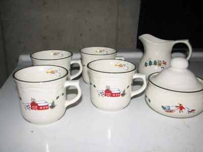 I have four cereal bowls along with whats pictured. These are super cute but I will not be using them I would love to see them get out of a box and enjoyed by someone. I would like to barter for sewing patterns,Material or scrapbook stuff. I am really open to anything to barter I am not picky.