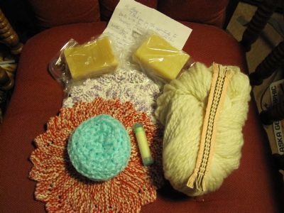 What a wonderful assortment you sent! I love it all. The hand spun yarn is absolutely wonderful. The soap smells yummy and can't wait to try the lip balm. The wash cloths and scrubby are perfect and the book mark will be used tonight! Thank you...Thank you...Thank you! Hugs, Mary