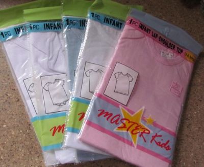 There are 4 onesies (3 white, 1 blue) and one pink t-shirt - all 0-6 months. New. This was an embroidery project that never got started.