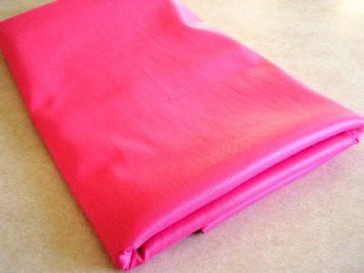 #1. 3 yds., 44" wide bright pink cotton blend with a polished cotton look, but a bit heavier. It would drape nicely for curtains or such like. A piece approx. 9 x 19 inches has been cut from one end