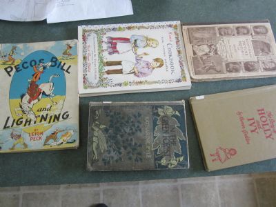 I have 5 old books which I'd like to barter if anyone's interested inthem. I'd like to find someone who would take all 5 of them :) The books are: Pecos Bill and Lightning, Kim's Cookbook for Young People, In the Green Forest, The Story of Holly and Ivy, and Yound Folks' Picture History of Music. They're mostly all old library discards, in varying condition.