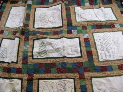 Snowman Collector Quilt. This was a block of the month. Instead of applique, I embroidered the blocks. It is partially hand quilted. I will NEVER finish it. It is a very nice quilt. If someone would like to finish it, that would be great. MAKE ME AN OFFER. I have no idea what to ask for it.