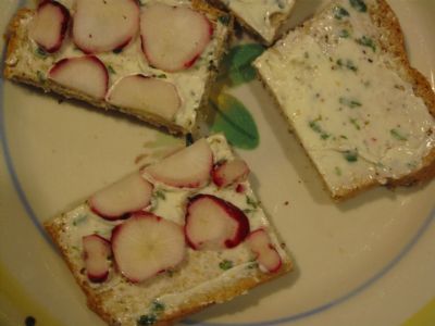 Meanwhile, the radishes ripened and so I made some homemade bread with the grain grinder, spread it with butter and added sliced radishes on top. Crunchy, spicy, and wonderful to eat!