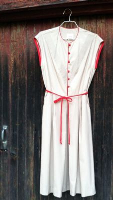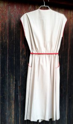 The other dress is true vintage, not repro, and the style looks 1950's/early 1960's to me. It's a great color combo of tan and red, with neat detailing like the pintucking on the front, lots of red bias tape binding, pockets, and tiny round plastic buttons. The skirt also bells out a bit more than it shows and would look cute with a floucy slip/petticoat underneath to give it shape.