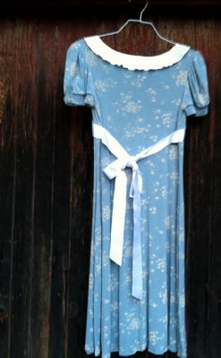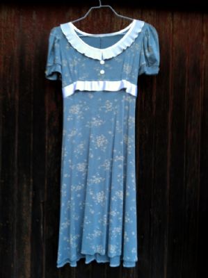 The first dress is a lovely, 1930's style. It is handmade, and I got it from a talented seamstress in Germany. She used a modern, stretchy, bouncy fabric (it's very comfortable) and embellished it with a white ribbon around the waist (sorry about the crooked bow in the pic!), a white, pleated ruffle collar, and antique-looking buttons on the little puff sleeves.