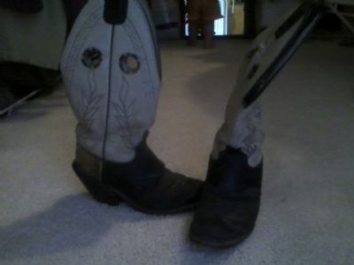I have a pair of boots that I would like to maybe trade someone. I hate to part with them but after several years of being out of them and two children later they no longer fit. They are Olathe brand cowboy boots. Black bottoms, cream tops, size: 7 1/2 D (Don't know when I ever wore that size!). They are still in great shape although they are worn. I wore them for a couple of years as my riding boots when I worked for an outfitter in the Wind River Range. If anyone has a good/cute pair of boots size 9 womens to trade I'd love to chat. I think the Ariat/Roper type boots. I don't want a huge heel as I'm not riding anymore but I sure need a good pair of boots to clean out a chicken coop and protect against goat heads and snakes.
