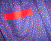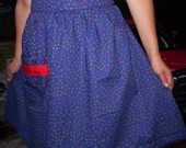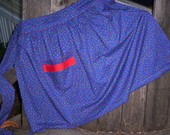 These are some photos of one apron I currently have completed. I do make several other styles, so if you'd prefer something different, I'd be happy to sew one. I make a great one that is more of a "work apron". It covers front & back, goes over your shoulders, fastens on the sides and has pockets on the bottom (just think "kindergarten painting smock" for ladies :) )