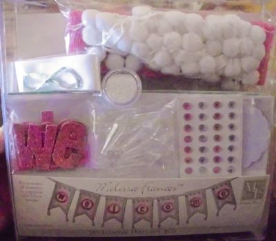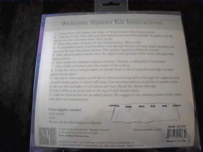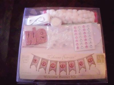 I would love to barter this brand new Melissa Frances Welcome Banner Kit. I thought I would make it.....but you know how that goes. It is three feet long when finished and is very cute pastel green and glittery pink. Would be very cute for a baby or bridal shower or just a shabby chic welcome banner. I would like to barter for any kind of vintage paper ephemera....old cookbooks, vintage cards, bits of paper ephemera, etc. Or, if you have something special to offer let me know. I love handmade tags, jams, honey, pretty much anything.