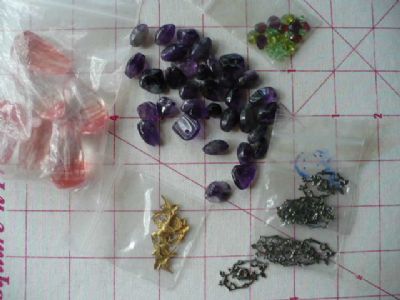 I know I have Amythist, rose quartz, onyx from tiny to large size. Metal embellishments floral about the size of a half dollar.