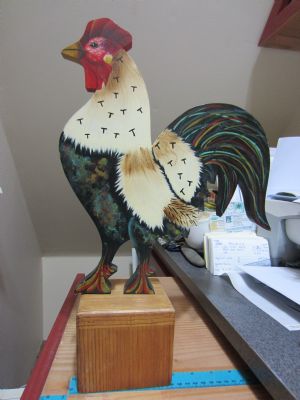 I have a hand painted chicken (rooster) that is mounted on a wooden box to trade. It is very colorful and measures about 17" high including the box. It would look so cute in your country kitchen! I would like to trade for fiestaware, vintage looking rubber stamps, squashed pennies, marbles, or anything you make (I love crochet or knitted wash cloths)...surprise me!