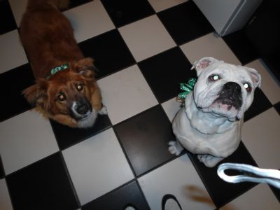 Marly, Molly is the one on the left Corgi/Aussie mix and the other is Tank, English Bulldog. They sure did enjoy their walk in the sunshine today!