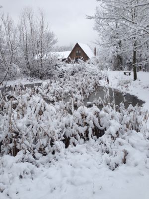 Pic of our house from our pond after a peaceful snow.