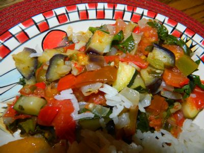 We made Ratatouille with all veggies and herbs picked fresh from the garden. Eggplant, Zucchini, Onion, Garlic, Red and Green Peppers, Parsley, Thyme, Basil and I almost for got--Tomatoes too. It was yummy. We served it with rice and peaches. MB