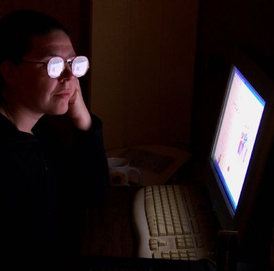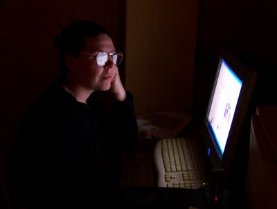 The edited version of mom's photo was cropped in GIMP (google image manipulation program, a free photoshop type photo). Then I removed the lights from her monitor and wireless card, copied the reflection in the left lens to the right lens, added some contrast there, and brightened up the PC screen. It took us about half an hour.
