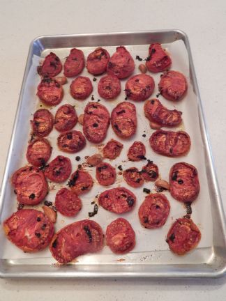 1. Remove stem area 2. Cut tomatoes in half, and place cut side up on parchment lined baking sheet 3. Use one whole garlic head with cloves separated dropped in random spots on the tomatoes 4. Sprinkle with any herb of your choice or combination 5. Salt and pepper and drizzle with olive oil, generously 6. Roast in preheated oven at 275 for 5 hours. Cool and bag them up to freeze.