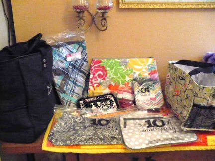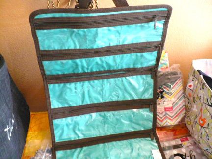 One insulated tote floral $10 One pink and black wallet $8 One teal wall or car organizer with pockets and zipper pouches see photo 2 $15 One insulated drink holder $8 One purse skirt $10 One small organizer tote bird pattern $10 One large tote zipper pouch $10 Large black tote $20 says Thirty-One on front