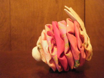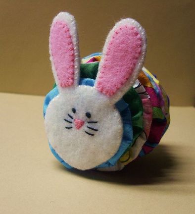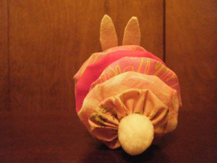 to make these, I stitch up 4 large yoyos, 2 med ones and 2 small ones, put in order as small, med, lrg,lrg,lrg,lrg,med,sm.. then I used embroirdery floss to secure them together. (and a dab of glue to give extra security. then cut out the head/ears , stitched on the eyes, whiskers, nose and glued the whole face to one side of the yoyo and a pompom to the other/backside.... 'sew' easy peasy to make.