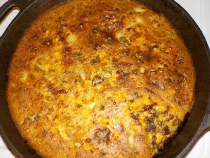 For the main course: Using a 12" cast iron skillet 2TBS butter 1 pound hamburger 1/2 large onion, chopped 12 oz bag of frozen sweet corn salt and pepper to taste 1/2 cup hot pepper cheese candied jalapeno peppers