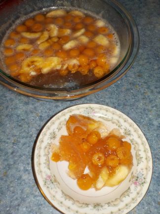 Canned tart cherries in water. I used the juice from 2 jars to get 2 cups, but only one jar of fruit for this recipe. half a large banana, sliced 1/4 cup sugar 1 tsp chillover powder