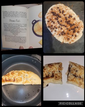 I used a basic Irish Farl recipie. It is like a cake/bread. It had no salt measurement, so my recipie I used 1 tsp salt. The basic recipie is in the photo. Because it is a plain bland bread, I added cinnamon and chocolate chips. Folded over like a French crepe, pan fried. It turned out tasty.